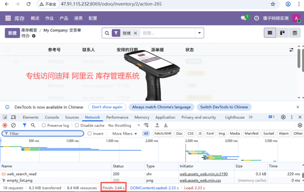 本次测试以迪拜阿里云上的 Odoo WMS 仓储系统为对象,对比公网与专线在真实使用场景下的表现差异。