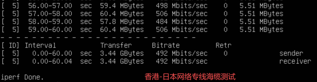 | 网络专线 | 稳定在约 490Mbps,偶有 Retr |