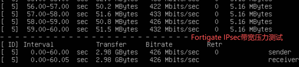 | FortiGate 公网 IPsec | 稳定在约 400Mbps,超过 450Mbps 后出现 Retr |