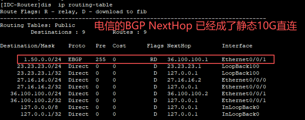 IDC 路由器通过策略控制:从 BGP 线路学习路由,将下一跳强制修改为 10G 静态出口。
