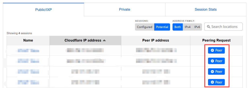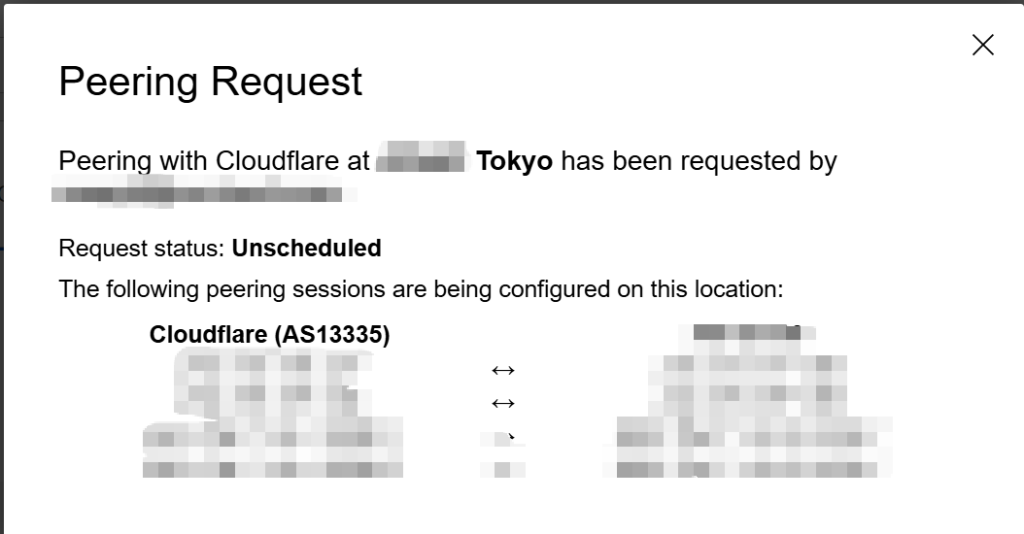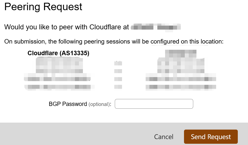 选择对应的IX节点,填写 BGP 密码并提交申请,请求进入 Cloudflare 的自动化审核流程,等待对等关系建立。