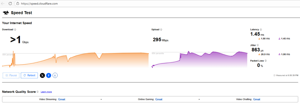 使用 Cloudflare 官方测速工具(speed.cloudflare.com),验证访问 Cloudflare 节点的实际 RTT、吞吐能力与稳定性;