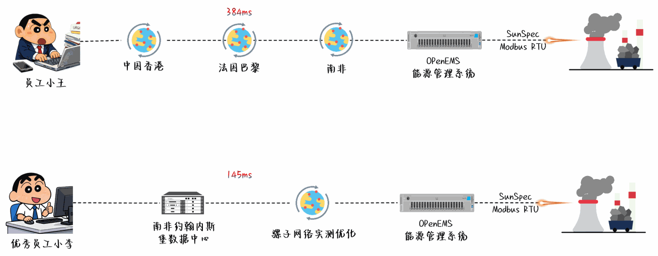 这次开展南非约翰内斯堡能源项目网络专线测试,起因是一个实际运行中的能源系统项目。随着项目运行时间变长,南非节点变为业务系统重要的部分,与总部之间的交互频率增加,对网络稳定性提出了更高要求。