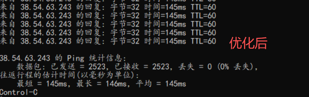 优化后:30 分钟测试周期内,丢包率为 0%,平均延时约 145 ms,探测结果保持稳定。