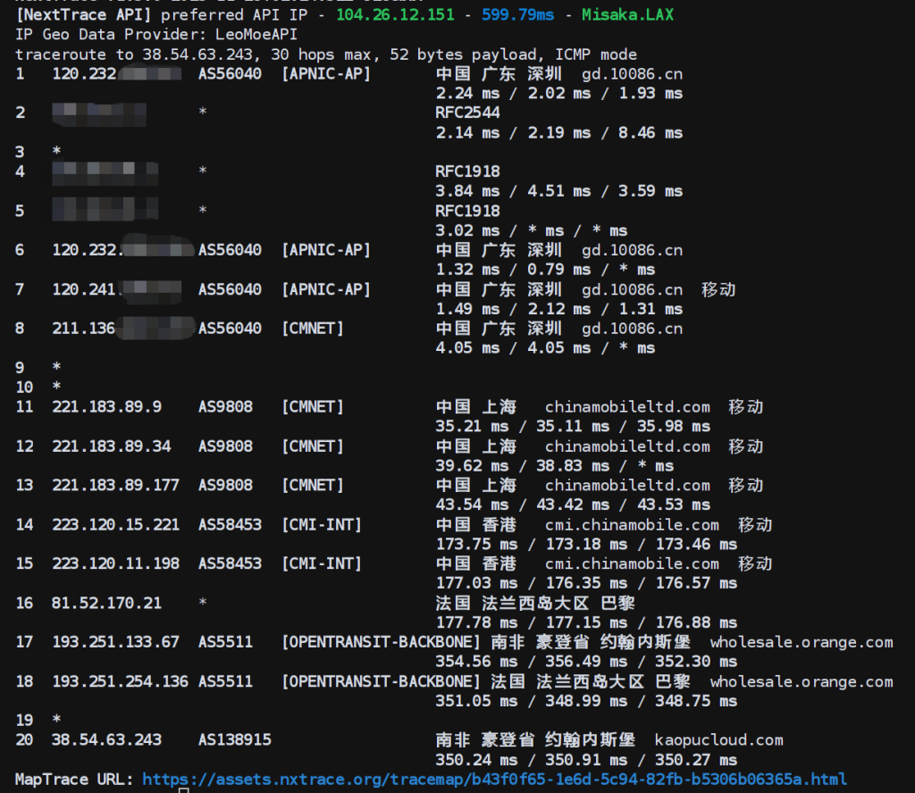 优化后:在南非方向引入独立专线,显示访问路径在 5 跳左右,经过中国香港→南非。