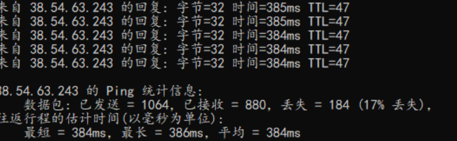 优化前:30 分钟测试周期内,丢包率约 17%,平均延时约 384 ms,探测结果存在明显波动。